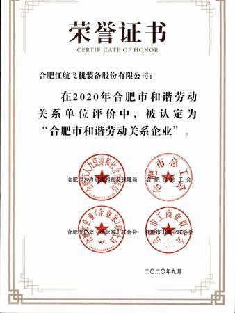 近日,由省人社厅、总工会、企联、工商联联合开展的“合肥市和谐劳动关系企业”认定工作,经过严格申报、审查、核定程序,公司获评“合肥市和谐劳动关系企业”荣誉称号。